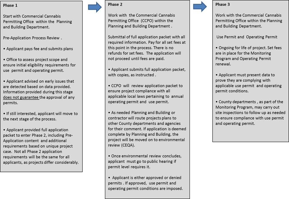 At this time, the Planning and Building Department is processing thirteen applications for commercial cannabis use permits and will work with each of the applicants to use this interim process if the applicant elects to do so. All applicants or residents with additional questions are encouraged to contact the Planning and Building Department, Commercial Cannabis Division, at (530) 621-5355 or by email at cannabisinfo@edcgov.us.